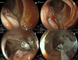 Figure 1 : Colonoscopy images. A and B: Elevated lesion with central mucosal disruption and active bleeding, located at the splenic flexure of the colon; C and D: Endoscopic hemostasis was achieved with diluted adrenaline, through-the-scope clips, and hemostatic powder.
