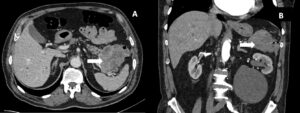 Figure 2: Transverse (A) and sagittal (B) CT images showing a lobulated, exophytic lesion (arrow) with peripheral enhancement and central hypodense areas, extending from the transverse colon and in direct contact with the pancreatic tail