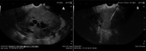 Figure 3: EUS shows a hypoechoic and heterogeneous mass with internal anechoic areas (A). Tissue sampling was performed using 22 G fine needle biopsy (FNB) (B)