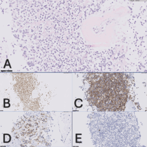 Fig. 3. Pathology: Neoplastic cells (A: H&E, 40X) positive for CAM 5.2 (B, 20X), synaptophysin (C, 40X) and chromogranin (D, 40X), with a Ki-65 of 1% (E, 40x).