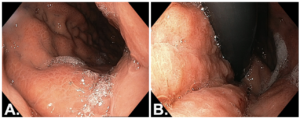 Figure 1. Upper GI endoscopy: A – Forward view of the gastric body. B – Retroflexed view of the gastric body.