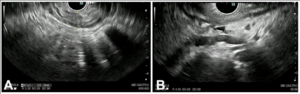 Figure 3. EUS: A – Gastric wall hipoechoic thickening (10 mm). B – Perigastric ascites and suspicious lymphnodes.