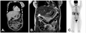 Figure 2.  A – Thoracic and abdominopelvic CT (coronal view). B – Abdominal MRI (T2, coronal view). C – Whole-body PET-CT (FDG).